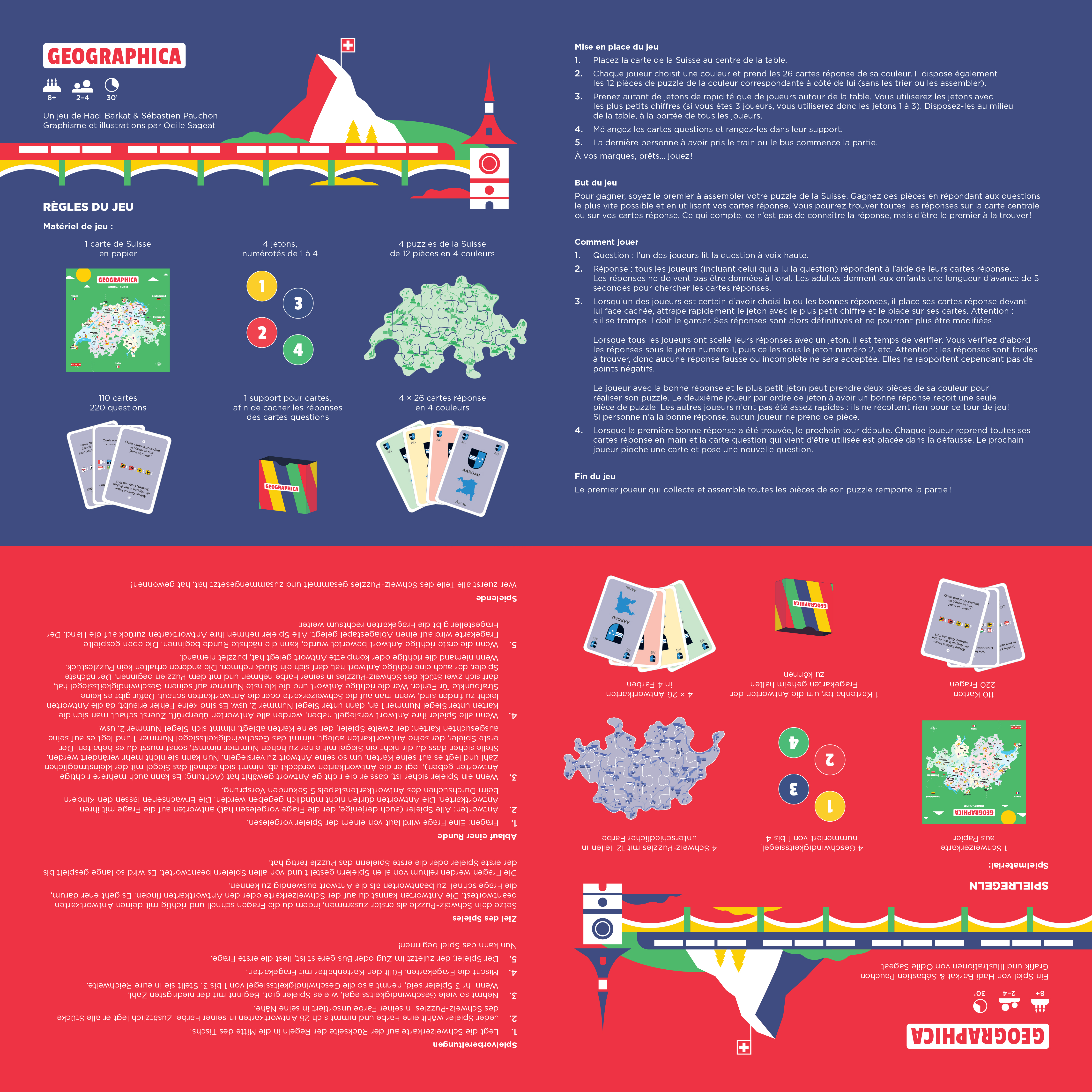 “Dans Geographica, tout le monde peut gagner, peu importe ses connaissances. Vous répondez aux questions en utilisant vos cartes représentant les cantons suisses. Pour trouver les réponses aux 220 questions du jeu, il vous faudra bien observer la carte géographique de la Suisse et être le ou la plus rapide. La personne qui termine son puzzle de la Suisse la première remporte la partie. Un quiz visuel dans lequel votre rapidité fera la différence.”